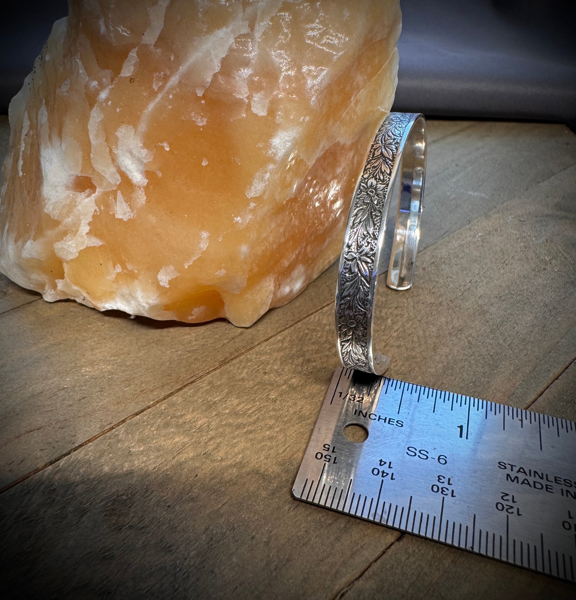 Elevate your everyday look with this sterling silver cuff bracelet featuring a beautifully intricate floral vine pattern. At just 1/4 inch wide, it offers delicate sophistication that complements any outfit with ease. Perfect for daily wear, this bracelet blends graceful design with lasting comfort, making it an essential accessory for timeless style.