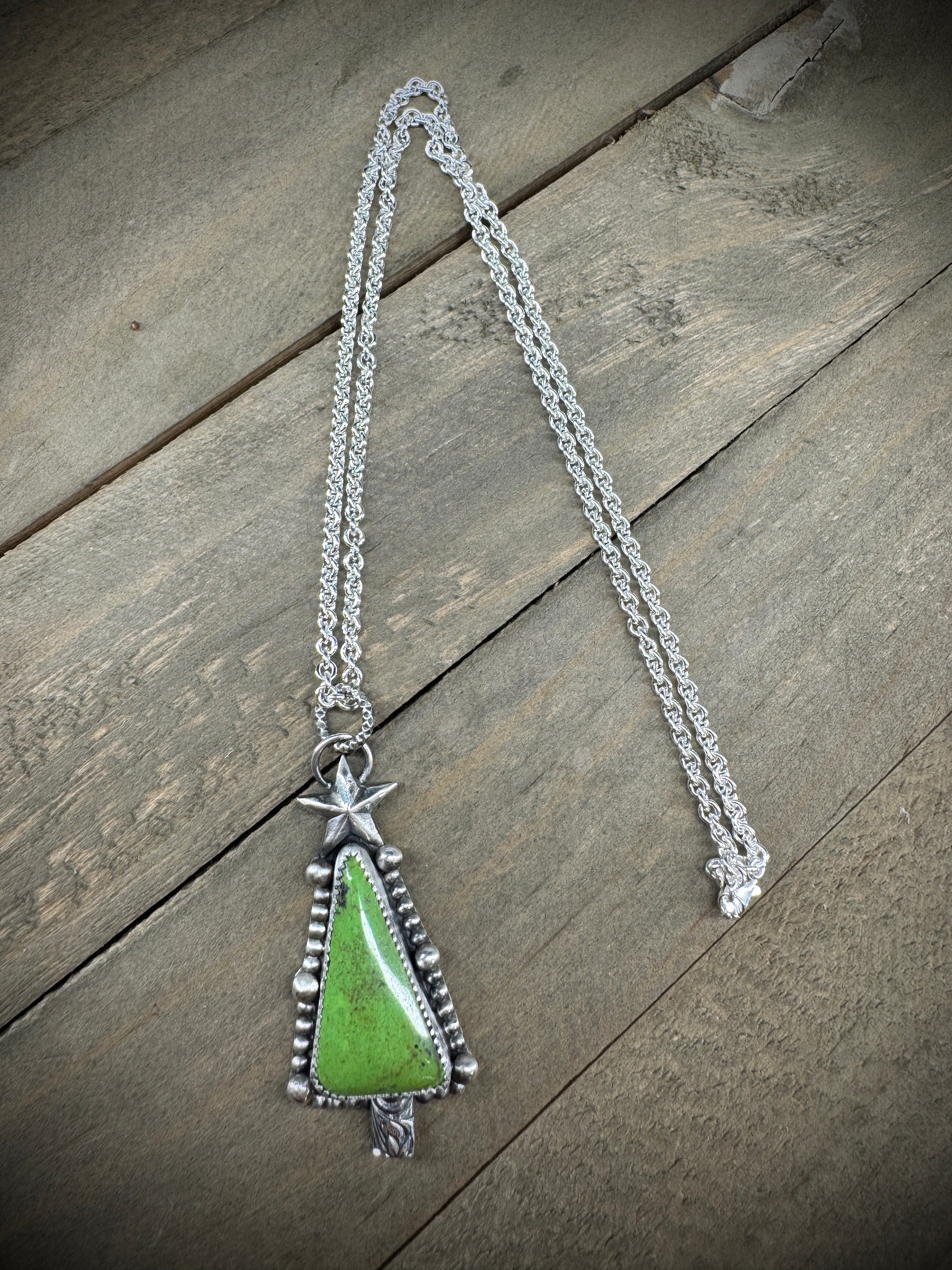 Celebrate the season with this charming Gaspéite Christmas Tree necklace! Featuring a vibrant green stone hand-cut into a festive tree silhouette and nestled in gleaming sterling silver, this playful pendant brings holiday spirit to any outfit. Suspended from a delicate sterling silver chain, it's the perfect gift for nature lovers and Christmas enthusiasts alike. A whimsical way to spread seasonal cheer year-round. Handcrafted in the Texas Hill Country.