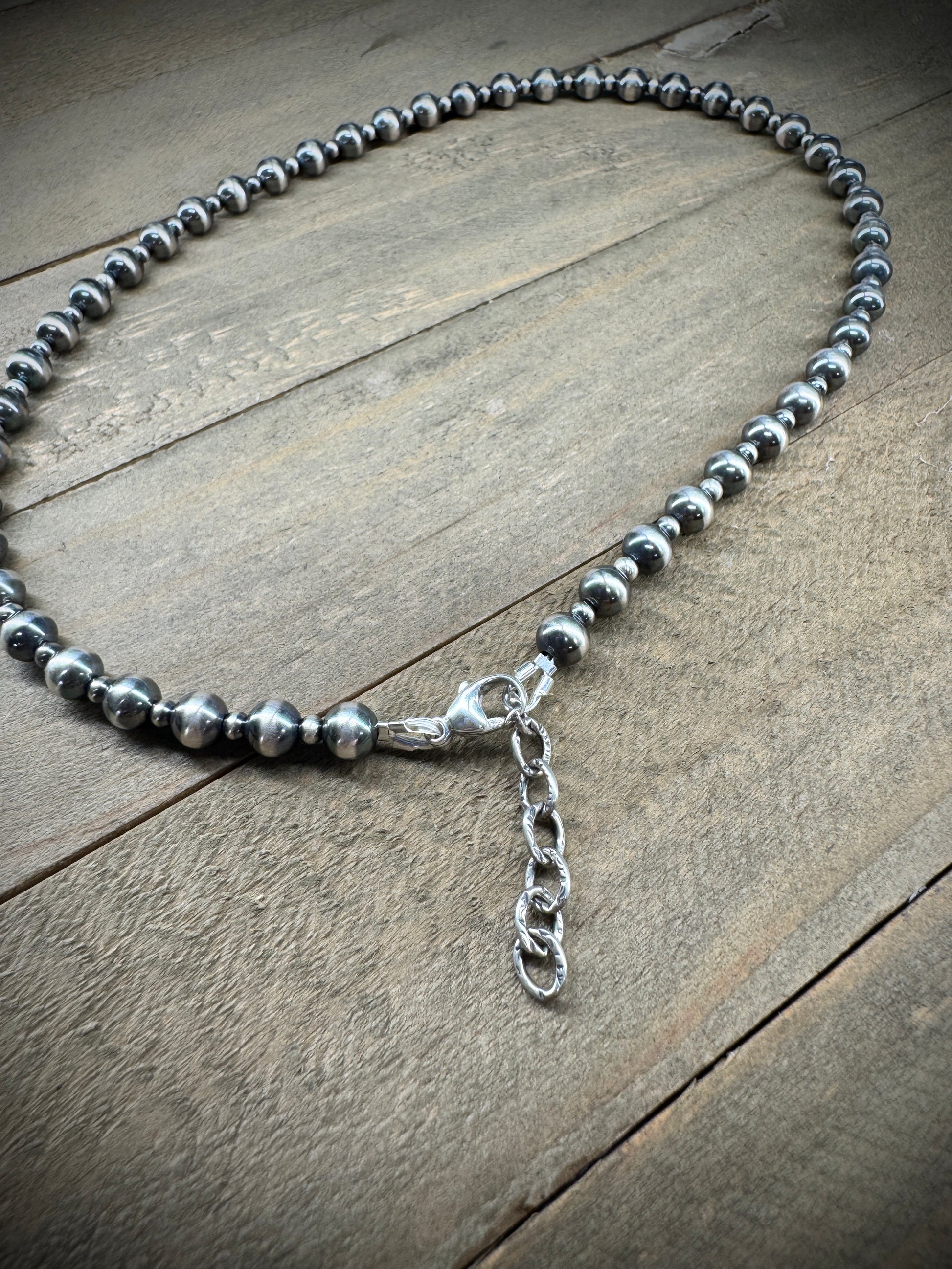 This stunning sterling silver Navajo pearl choker brings effortless elegance to any outfit. Featuring classic pearl beads strung on quality silver, it strikes the perfect balance between timeless and trendy. The adjustable design stretches from 14 to 16 inches, so you can rock it snug at the neck or layer it with other pieces for maximum style impact. Whether you're dressing up for a night out or adding polish to your everyday look, this versatile choker is your new go-to accessory.