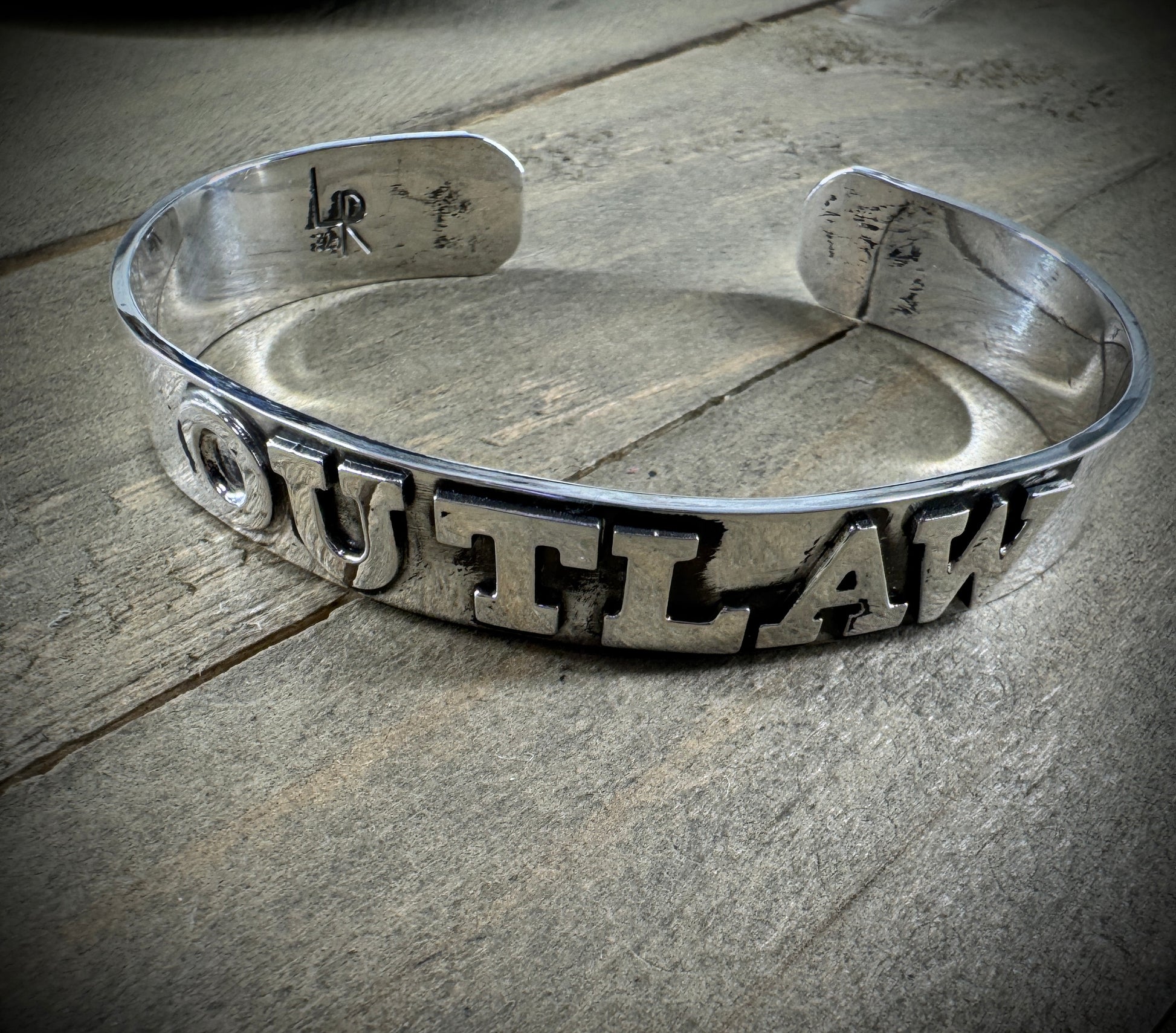 Rock your rebellious side with this bold Outlaw Cuff Bracelet. Crafted from heavy gauge sterling silver, this substantial piece features eye-catching outlaw letters adhered directly to the bracelet for an edgy, statement-making look. Perfect for those who dare to break the rules and stand out from the crowd. A playful nod to your wild spirit that's built to last. Handcrafted in the Texas Hill Country.