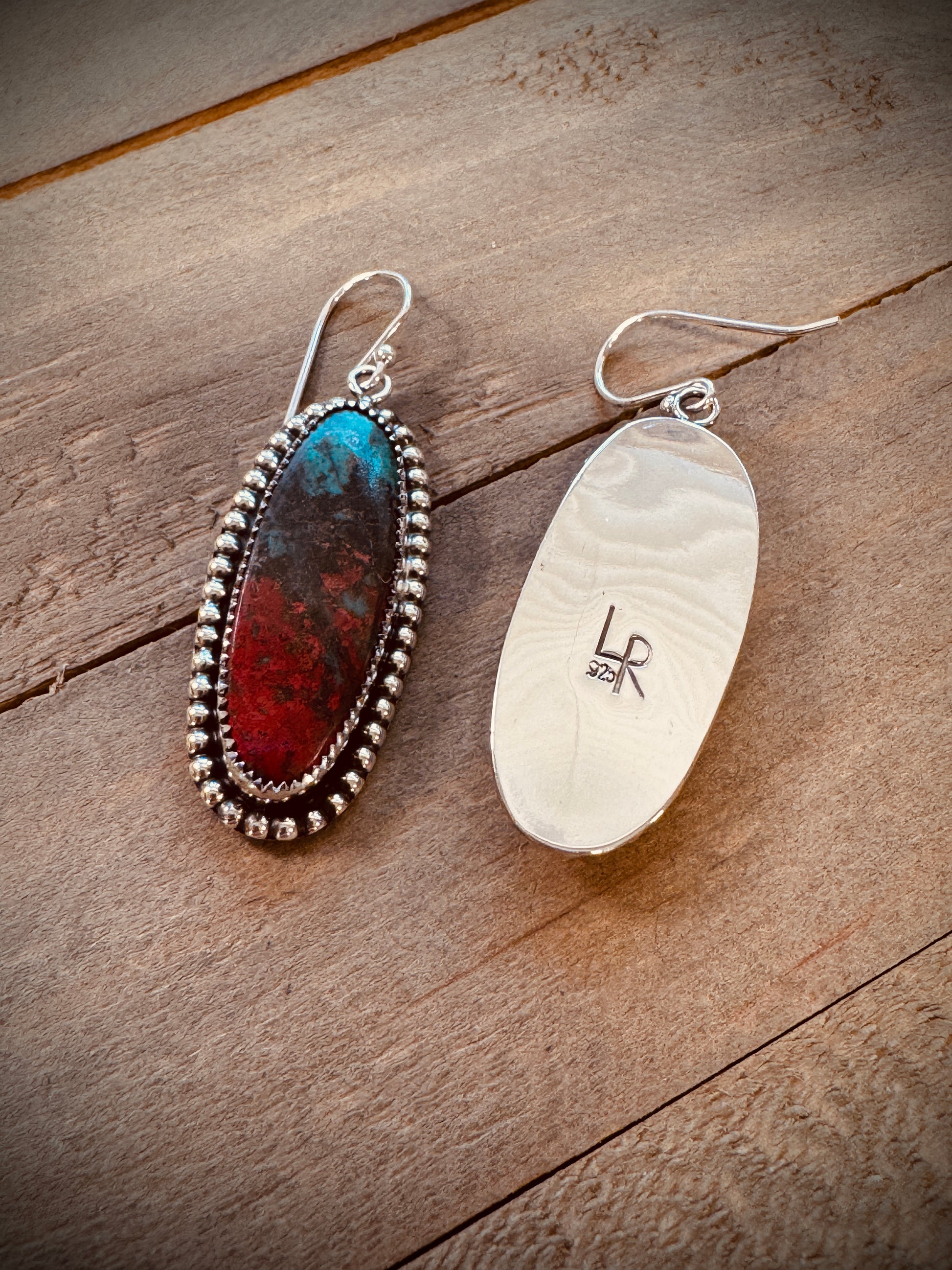Experience the vibrant beauty of Sonoran Sunrise Earrings, featuring a rare blend of chrysocolla and cuprite gemstones sourced from Sonora, Mexico. Each stone is carefully handpicked and set in elegant sterling silver, creating a striking accessory that captures the essence of the desert sunrise. Perfect for adding a unique, colorful touch to any outfit, these earrings combine natural artistry with timeless craftsmanship. Elevate your style with a piece that’s as distinctive as you are. Handcrafted in the Texas Hill Country.
