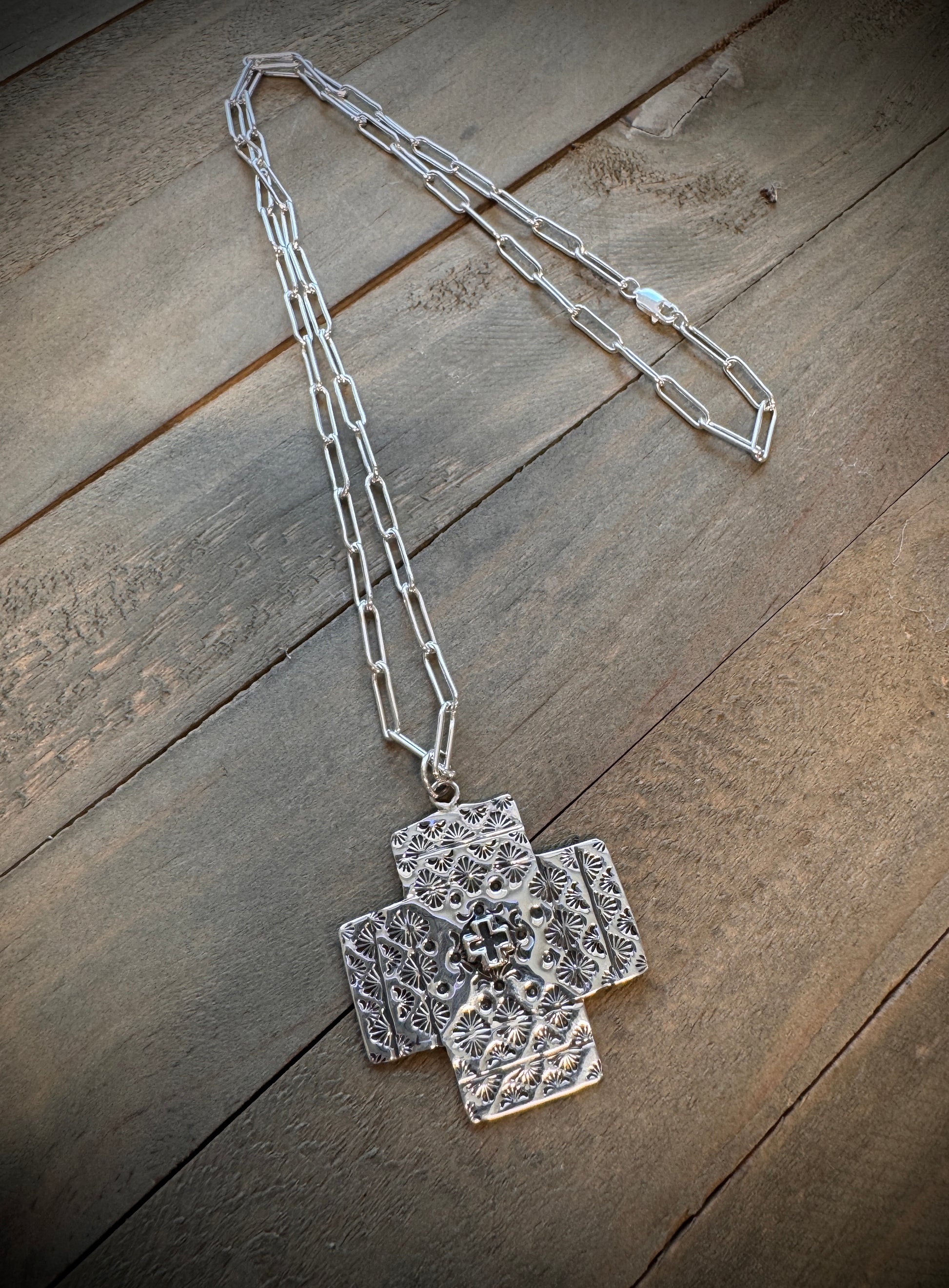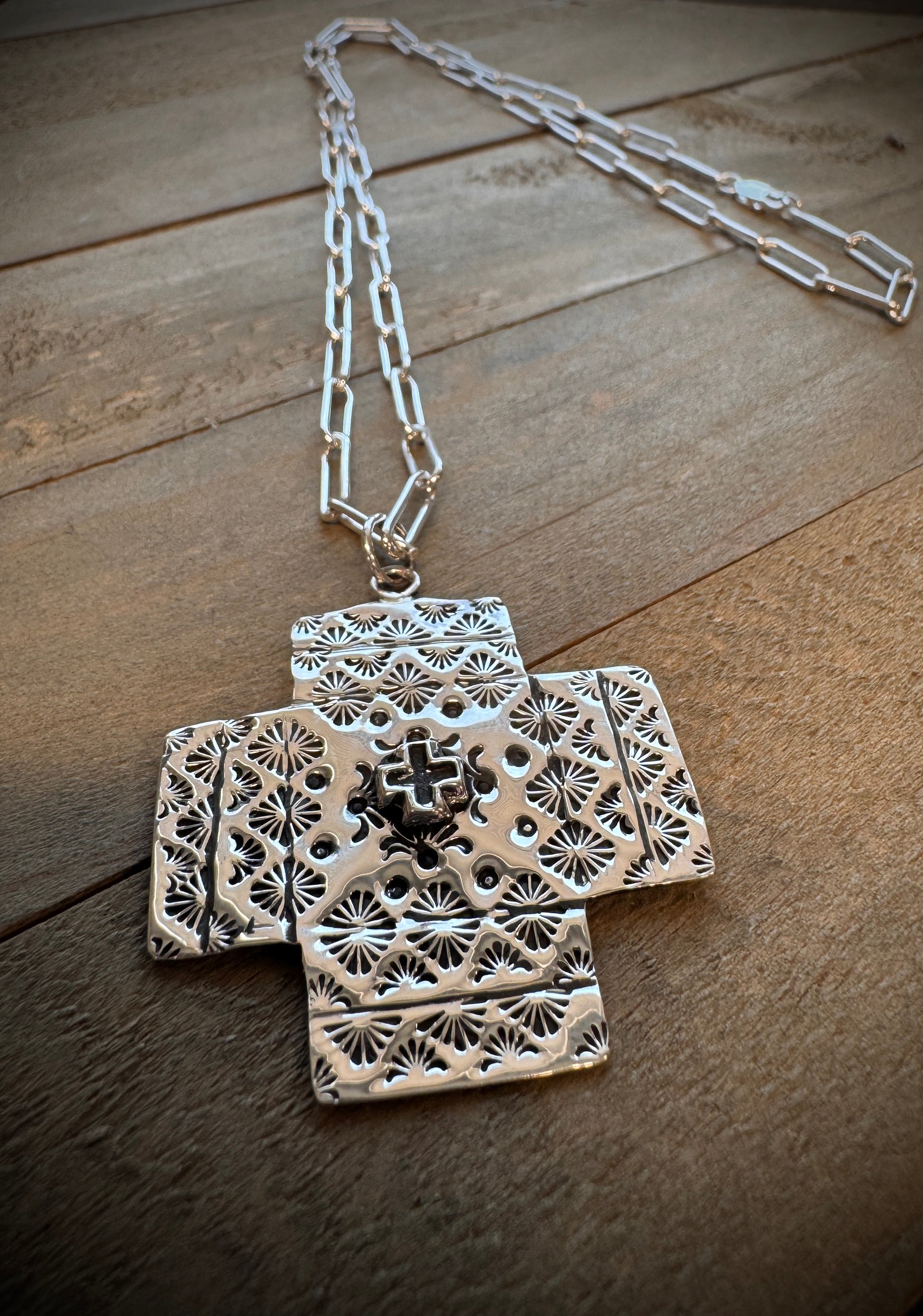 Elevate your style with this Southwest Cross Necklace, featuring a beautifully crafted sterling silver cross that captures the spirit of the Southwest. Paired with a sleek paperclip chain, it offers a modern twist on a timeless symbol. Perfect for adding a subtle yet meaningful touch to any outfit, this necklace combines elegance with everyday wearability. Handmade one of a kind item.